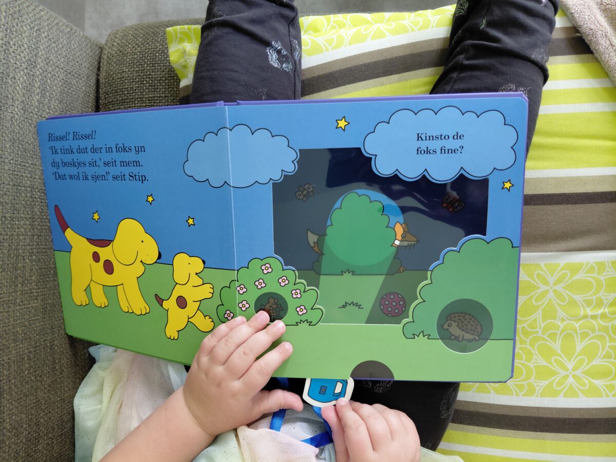 Sadree’t Janneke (3 jier) it boekje ‘It is bêdtiid, Stip!’ út it kadopapier helle hat, lêze we it boekje.